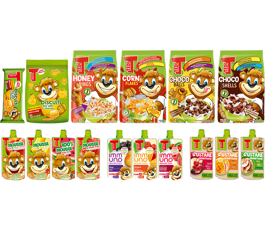 Produsele din gama Tedi sunt concepute pentru a completa alimentația copiilor cu opțiuni delicioase și ușor de consumat, fie la micul dejun, fie ca gustare între mese. Ambalajele sunt gândite pentru a fi practice și ușor de transportat, astfel încât produsele să poată fi savurate acasă, la școală sau în timpul activităților zilnice.